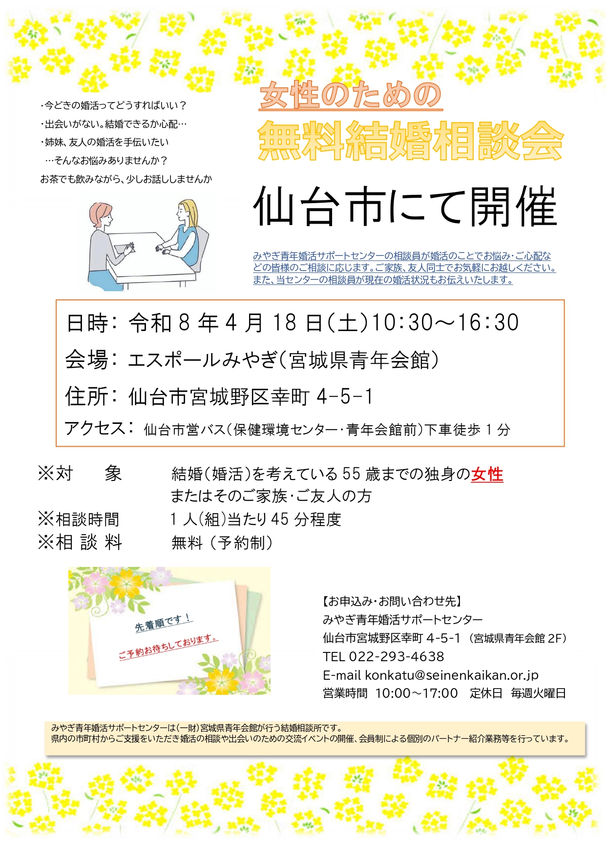 ▶申込・問い合わせ:みやぎ青年婚活サポートセンター