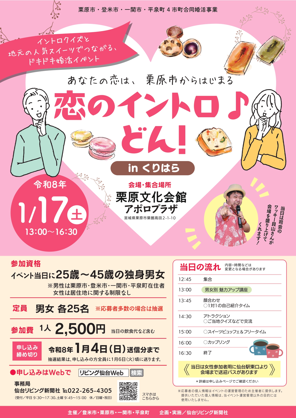 25歳~45歳までの独身男女 (男性は栗原市、登米市、一関市、平泉町在住者のみ)