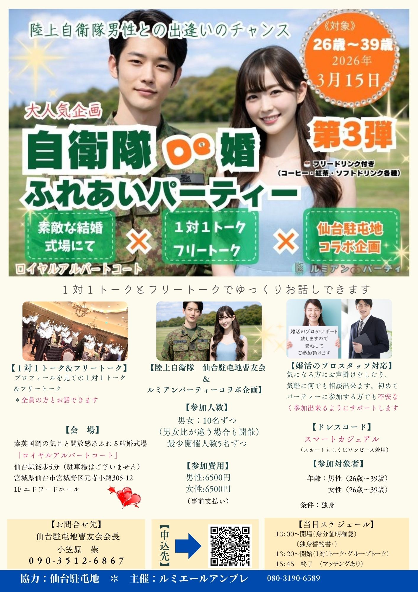 普段の生活ではなかなか出会う機会の少ない、結婚を真剣に考える自衛隊男性とのご縁をつなぐため、陸上自衛隊仙台駐屯基地ご協力のもと婚活パーティーを開催いたします。